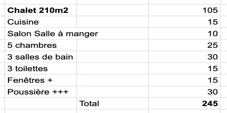 Nous avons donc mis au point une méthode de calcul prenant en compte tous ces points auxquels nous avons rajouté le dépoussiérage et les fenêtres. Ces 2 derniers aspects ont été divisés en 3 niveaux : un peu, moyen, beaucoup... un chalet peut ainsi avoir beaucoup de fenêtre et être très épuré. Il sera ainsi classé en "fenêtres +++" et "dépoussiérage +" alors qu'un autre pourra présenter beaucoup d'histoires en terme de livres, objets, sculptures, etc à dépoussiérer et peu de fenêtres, le classant ainsi en "fenêtres +" et "dépoussiérage +++".